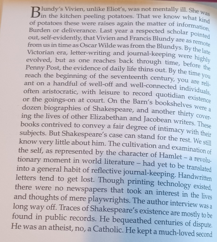 Like the 14 sonnets preceding it the sonnet is about the experience of passing time and the desire for the contradiction of its passing – that it ‘stay / For long enough to be a settled view’. The view into a spatial prospect is here aligned with the temporal prospect of the future of two lovers who must part – it is an old-fashioned trope in poetry. We desire to ‘wander here’ and not ‘agree to die’, though the logic of the passage is that time must pass from uncertainties and danger in ‘May’ to ‘disarray’ for ‘onwards’ has ‘always been the way to go’, to death and parting. It’s lovely but it is conventional. We know though we do not read it that Blundy’s poem is not. Much of Part one of the novel involves debate about whether Blundy wanted his poem to focus on ecological danger, but Part Two shows us that it may have had another purpose (no spoilers here). Whilst I do not think McEwan requires us to know Fuller’s poem, it makes sense if you do, for what Fuller feels about Prue, his wife, is very different to what Frabcis Blundy feels about Vivien, and much more complex. And it is here that space-time perspectives in the unread Blundy poem merge with the concern about space and time in the novel and the interwoven lives of its characters over great and small measured time and space gaps. You can enjoy all this for yourself, but here are tasters. Look at the time gaps opened in this early set of sentences and how they are interpreted, in relation to ‘what we can know’ (really know, that is!) about William Shakespeare despite the plethora of books about him: