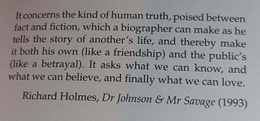 One way to try and understand the epigram from Richard Holmes to this novel (pictured immediately above) is that in order to know a person or people appears to require not only facts, the validity and reliability of the acquisition of which can be tested, but the ability to believe in and love the people you claim to know. In order to fulfill the demands of that whole process we need the ability to create fictions, or give credence and attachment himself to the fictive creations of others, that supplement the known facts, and are capable of integrating with them. The epigram is from a book from the same author as Footsteps, Adventures of a Romantic Biographer. The latter book is the one that the main protagonist of Part One of the novel and its first-person narrator, Tom Metcalfe informs us that he, in the imagined year 2119 of the novel’s setting where Holmes’s book is preserved as a rarity of a university library, reads (he even describes its original King Penguin cover showing ‘a painting by Hans Thoma’).