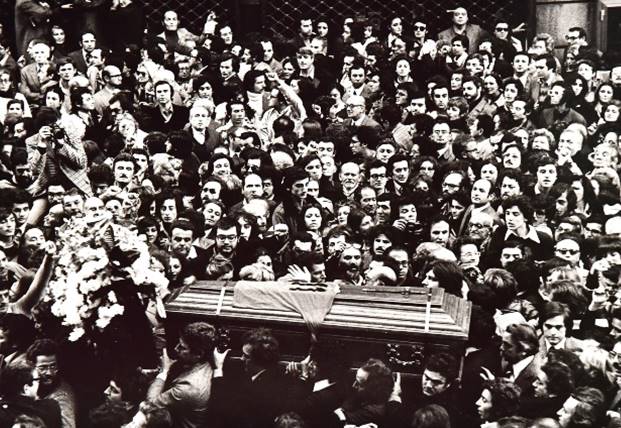 That part of the story ends with a picture (not the one below) of Pasolini’s funeral, showing the artist’s coffin surrounded by the ‘boys Pasolini fucked, the boys he listened to, found jobs for, helped, the boys he insisted on putting at the centre of the story’.[9]