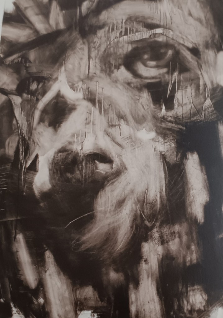 Detail from B&W photograph of Anthony Micallef Animal Head (Oil on linen ) 140 cm x 140 cm Lazarides catalogue of show in Sept – October 2009, p.16.
