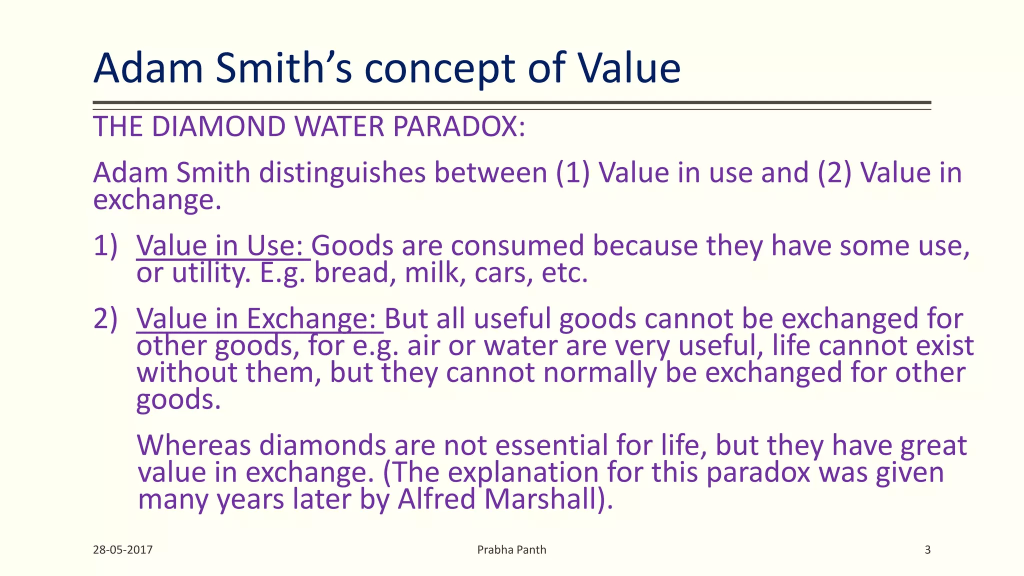Some write ups of the concept of this eighteenth century moral philosopher [see this blog on the James Graham play Make It Happen, which featured Smith, at this year’s Edinburgh International Festival] fail to emphasis the paradoxical in this distinction – that something of far more use value (indeed to necessity) in this comparison has less exchange (or monetary) value than a useless thing like a diamond.