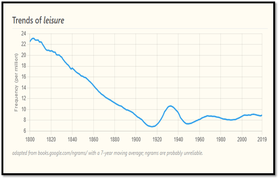 But where in this world can we find this leisure to escape all time, all change and ‘wear’, where even ‘leisure’ is an industry – in my view for its consumers too working hard at eking out pleasure from that leisure, rather than just escaping time by its imagined or real evasion. And id we go back to etymology.com on leisure, look at the chart of its changing frequencies over time in written text (remembering that n-grams are not considered statistically valid or reliable).