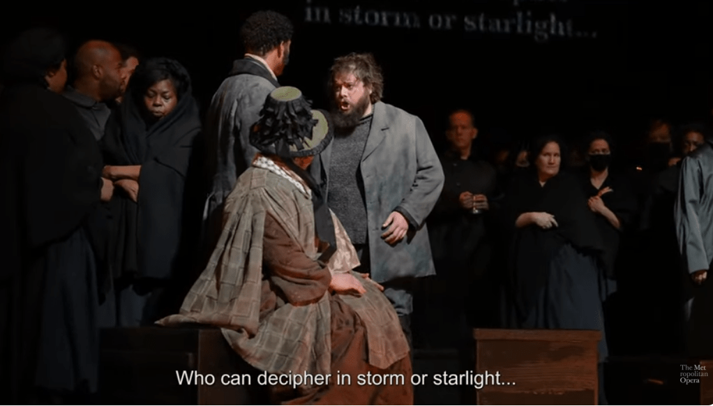 Peter is helpless and clueless but nevertheless still feels he is ‘different’ in both dream and vision: after all, he will later tell us, in Scene 2 of the same Act, that he ‘can see / The shoals to which the rest are blind’. Does his visionary Byronic heroism again come down to the size of the catches he can aim at as a fisherman and for whom the boys in his employ die. Some productions use the grandiose inarticulate to suggest that Peter wants someone in his community to be able to read clearly in him that which is obscure to him, however hards he tries to decipher the characters of his individual destiny. In John Doyle’s production for the Metropolitan Opera New York, Adam Clayton as Grimes (below) seems desperate to engage someone, passing between borough residents but receiving no adequate response.