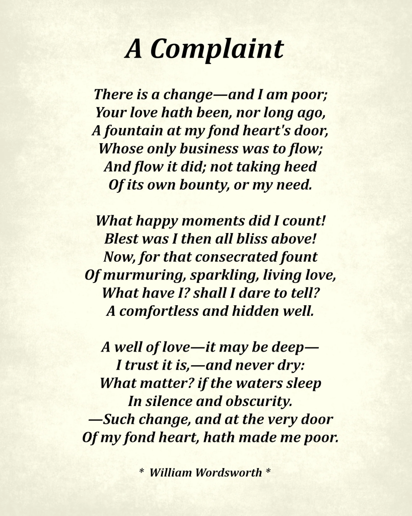 The speaker in Wordsworth’s lyric complains his lot by rendering it in imagery of a stagnant well, stagnant because no fountain feeds into it now and neither do its waters now appear to move on from its own static depth. Oddly being without love is like being cast into ‘silence and obscurity’ and being ‘poor (by which the meaning of being in poverty’ seems to be attached, as if it is the flow of cash that seems too to have stopped for the now poor person). The poem is a ‘Poor Me’ poem, for it lays all personal fortune on external forces, not the resolution and independence, the later Wordsworth valued and which made him say later, in the poem Resolution and Independence, that we can should only reliance on ourselves for shelter, food and love, because ‘needful things’ do not ‘;come unsought’.