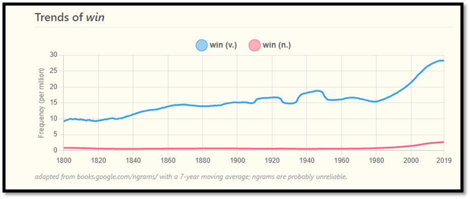 Perhaps also trends in the use of the verb ‘win’ (the blue line in the graph) tell the story in part, compared with the trends in the noun (the red line). After all, yo talk of a win, or the win, presupposes the existence of a win in some form ( a cheque or a letter even if not the valuable monetary asset (gold for instance) per se), to talk of ‘winning’ in no way presupposes that existence, exceopt in thoughts and / or imagination. As unregulated capitalism and the commodification of desire takes hold even in the masses up to near the present day, 2019 – though the line is stabilising).