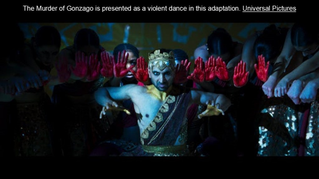 The brilliant choreography (by classical Kathak dancer Akram Khan) reads, within the logic of this film’s narrative, as a direct threat of violence towards Claudius. The dancers’ fists create a funnel for poisoned wine to be tipped into the dancer Gonzago’s ear while Hamlet, apparently deranged by grief, watches eagerly.