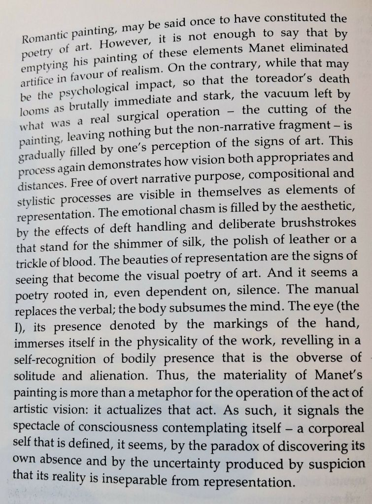 The idea is a gross simplification of what Rubin says even here, but I am allowing my absinthe-drinker who is supposed to speak the lines to be an under-reader of complexities of art theoretical statements. In fact Rubin’s point is that Manet, and impressionism too as a whole, is a practice in which vision is guided by the hand so that painters do not use stock or conventional ways of representing what they see in the world, or memories from the practice of past artistic Master. He believes that giving the hand relative freedom to experiment in representing vision of the external world, and allowing signs of that experimentation to survive in the finished artwork means the hand guides the eye to re-see the world anew – as it actually looks not what past painters thought it looked like. The idea can be represented in reverse too and mean much the same – the eye guides the hand, because what the hand does that does not satisfy the eye’s vision can ve scraped off or over into a pentimento. The pot is that it is not the ‘mind’ that guides us if ‘mind’ means memory, especially memory of a painter’s training rather than of a painter’s vision en plein air. This is even ore fully spelled out on the last page of that chapter (see below) about the need for Manet to reduce the narrative element of a picture in order to highlight a central visual impact – as in his painting of the death of a toreador. He cut down the painting from one with a narrative or theatrical context to one pared down to the look of the death of the man himself.