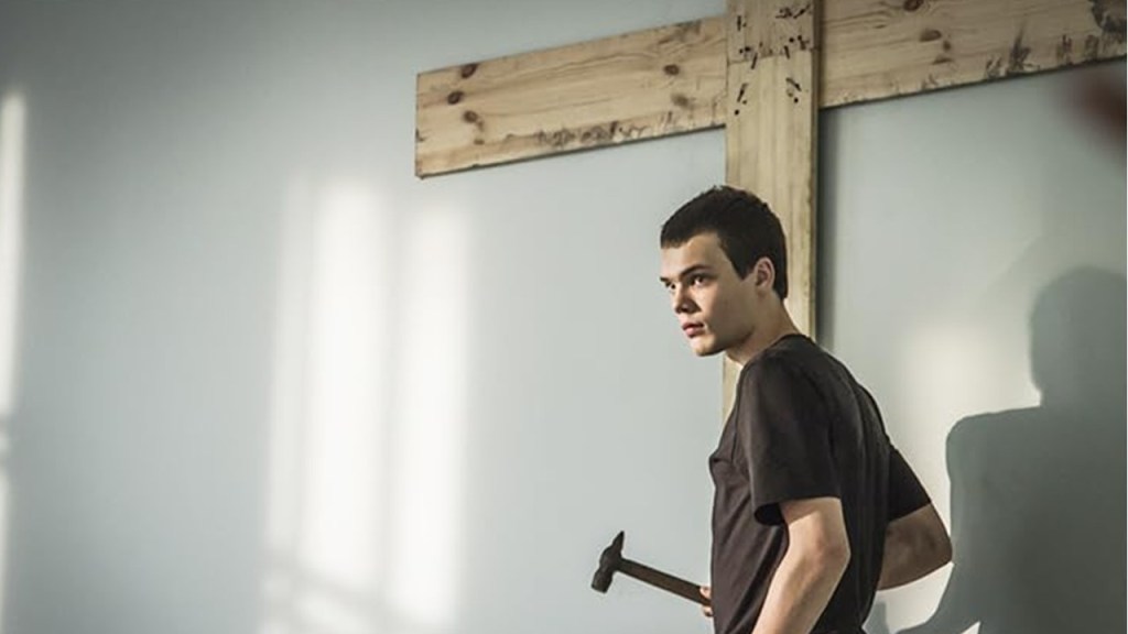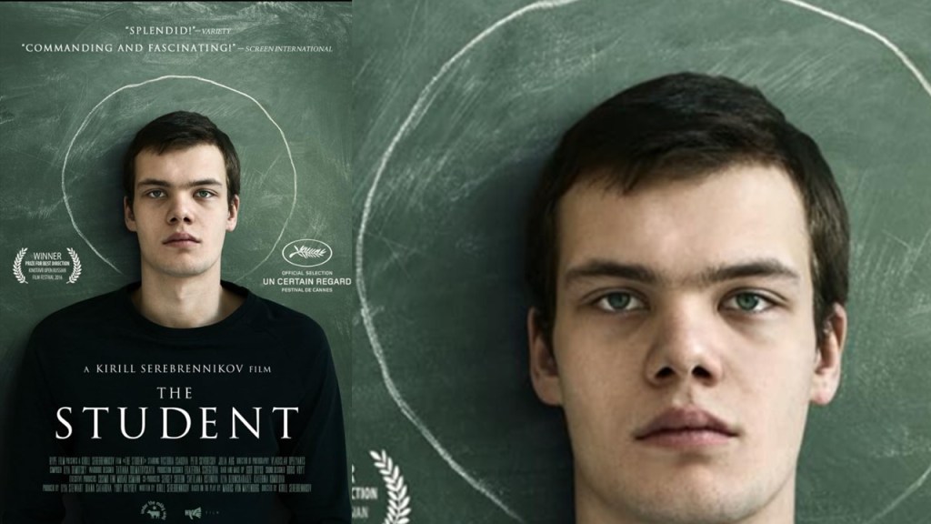 What if you discovered that every truth you will; ever need, sufficient to contest any other truth, except its own contradictions from the same source, was in one book. What if, you then identified with the embodied principles of that book to become its incarnate central character. At one point Veniamin in Kirill Serebrennikov’s film The Student, a boy whom we see well into his obsession with one book from the get-go – the Bible -defines himself as a saint, drawing a halo in chalk on the greenboard behind him in class the better to challenge his teachers, and the class – whichever appears to oppress him most at the time. Later he will build a structure from a desk and one metal-frame chair to bang on the wall from its pinnacle with nails and a hammer a wooden plyboard cross (impractical of course for actual physical crucifixion) to the wall of a classroom.