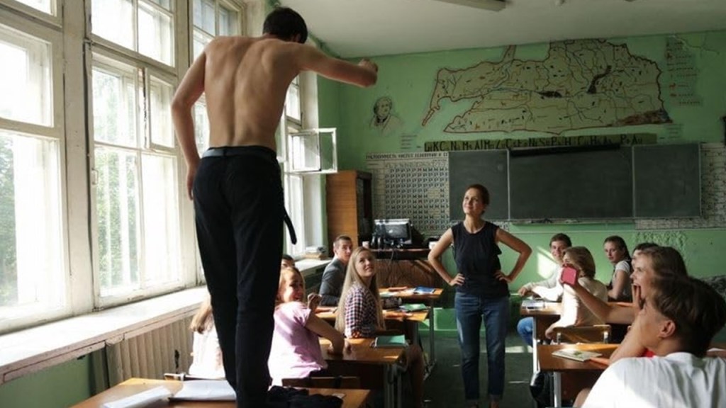 The Russian President’s photograph hovers on the walls of the school that is perpetually trying to moderate and absorb into itself an Orthodox priest teaching the most putrid antisemitism based on the medieval thought of St John Chrysostom (born 407 A.D) in the school with any and all points of view, including, provided she does not want to promote it as the hegemonic view of the school, the belief in scientific reason of a left-leaning Jewish woman who takes Darwin and STD awareness training as very literal truths. The priest tries to absorb what he calls Venjamin’s ‘passion’ into something approaching the school’s own uncritical take on the necessity for verbal challenges to either right or left, ancient or modern, dictatorship (the students must write on tne advantages of Stalinism at one point) or democracy, provided nothing has to change drastically from the status quo as a result, which is I think exactly Putin’s view of Russian ideology.