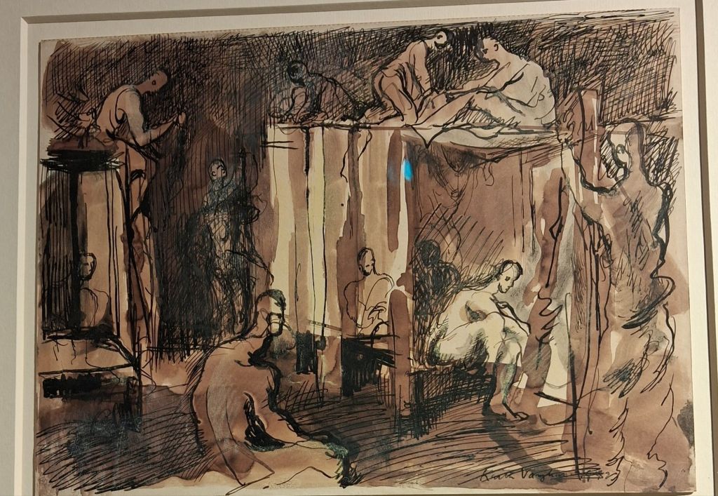 Nevertheless, this is not the joyful sense of what human communion might be, as in Vaughan’s earlier drawings from the barracks from conscientious objectors who went into home service in the 1940s: