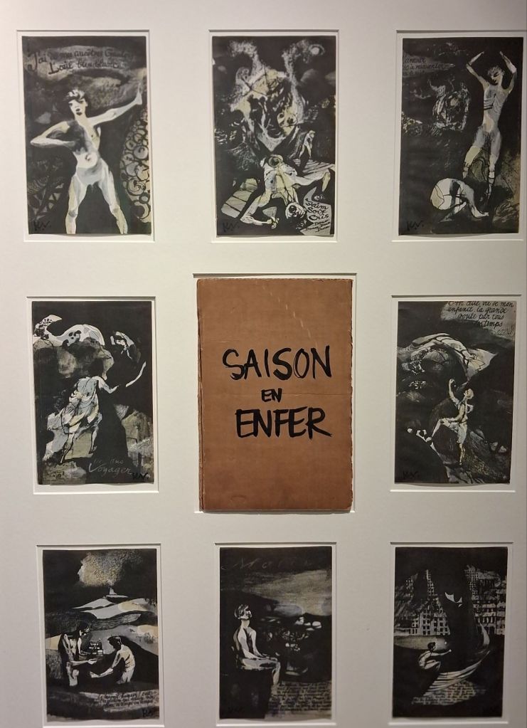 But even in early book illustrations, Vaughan conceptualised his figures guided by philosophical romantic-existentialism, more Gide and Rimbaud than Sartre, as in the fascinating original studies, complete with Vaughan’s homemade folder for Rimbaud’s A Season in Hell, some of which already preferred Nude Against A Rock.