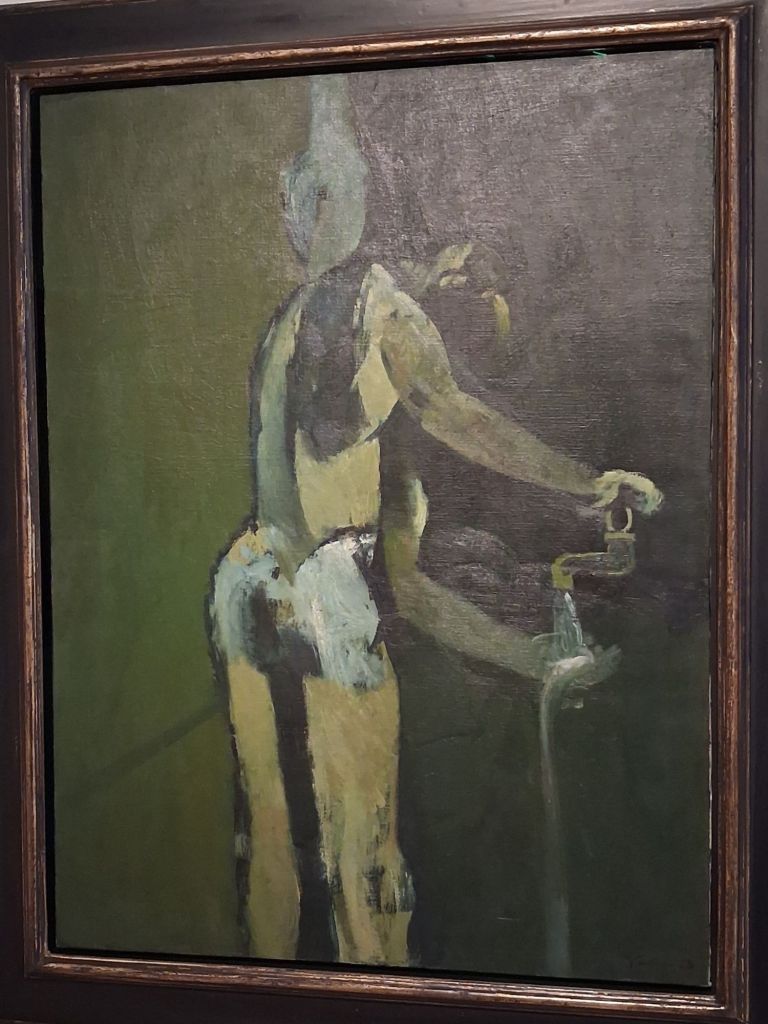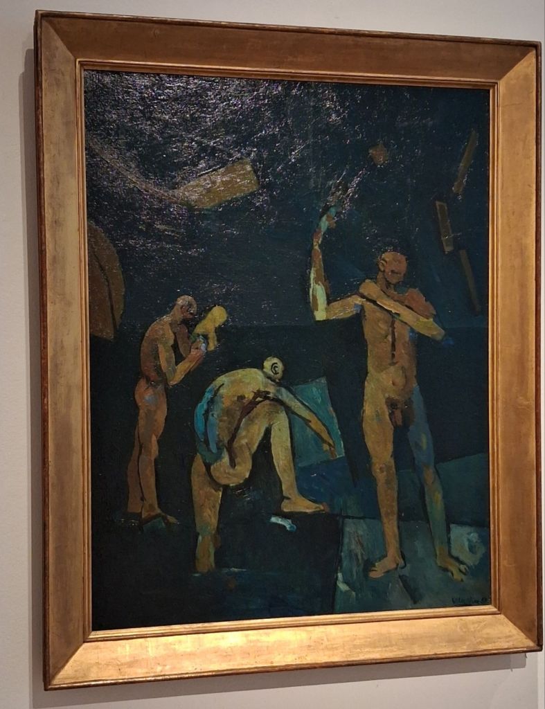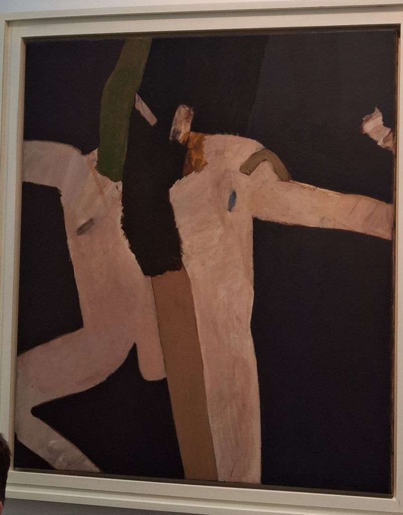 Of course we are near the Assembly pictures here, especially in this lovely beach piece, where the pattern made by figures externally is marred by the tendency of the over-expressiveness of the paint such that the background reads like something within the men’s negotiation of space with distance and partial proximity.