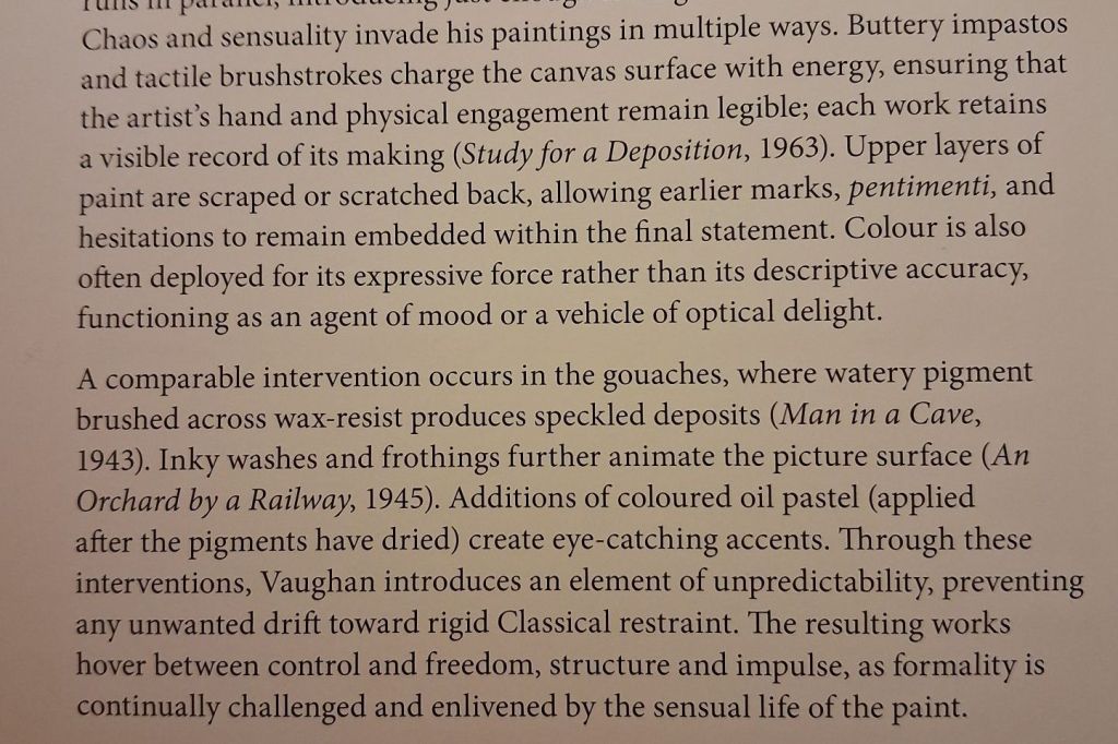 It is of war ruins, but it allowed for a useful cross reference between the exhibitions, for Gerard Hastings in his catalogue essay for the Osbourne Samuel exhibition writes of Vaughan, for instance, learning from Sutherland how to build impasto effects in gouache using a wax-resist method that had the same effect of allowing romantic ‘chaos and sensuality’ to invade a rather more classical ordering of figures and objects on the picture surface. I won’t try and describe the technique myself however, allowing this startling passage to represent Hasting’s views of Vaughan.