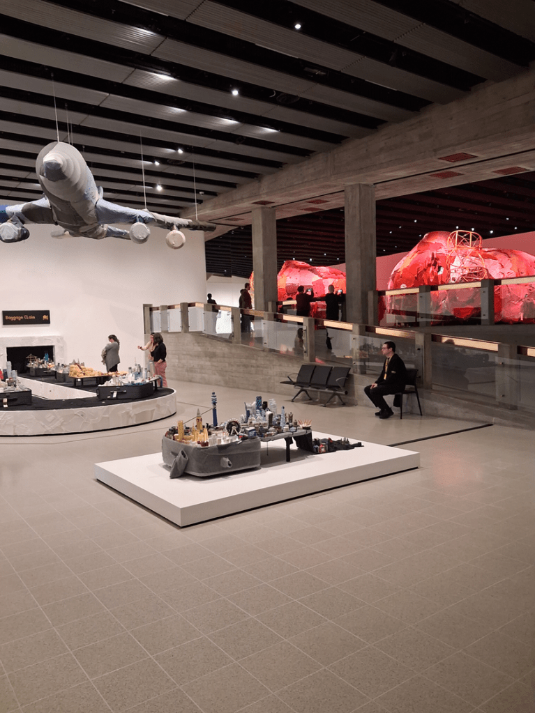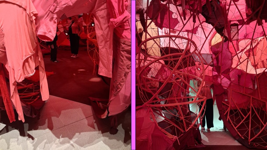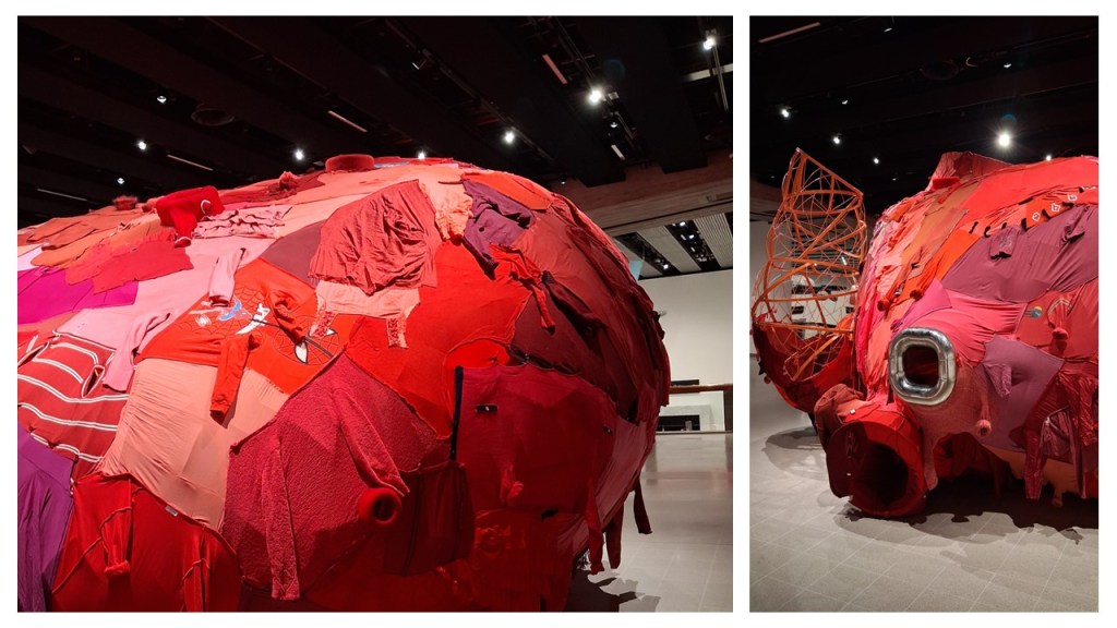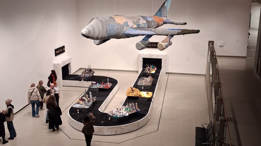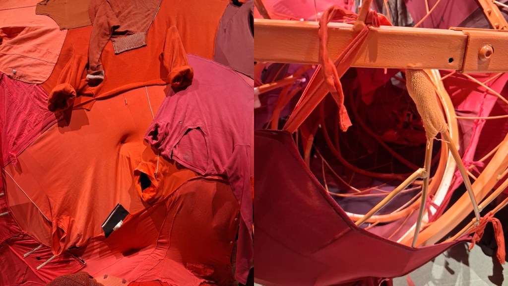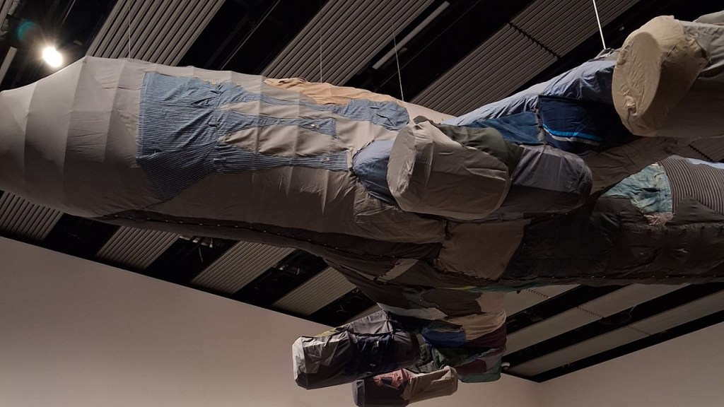 But before ending with Shiota’s haunting almost ethereal works (when not seen as they can be if you go at the right time, as sets for performance art where models use the pieces -see later my discussion of her new 2026 work for this exhibition During Sleep) lets get to the ‘heart of things and that wonderful elephantine heart created by Yin Xiuzhen. While we were gazing at International Flight, we were also looking beyond to the huge bulbous piece on the open intermezzine floor above, huger in look from here because mirrored in huge glass walls of the Hayward. Look again at a piece from an earlier collage: