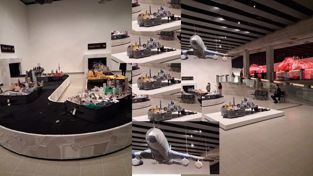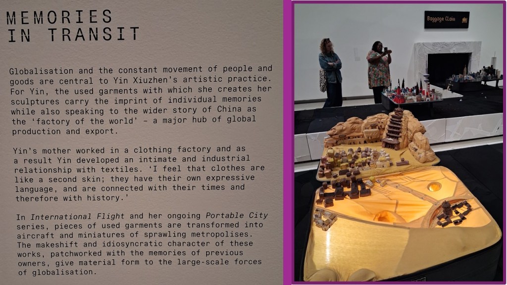 The first experience of Yin Xiuzhen’s work bears a plaque labelled ‘Memories in Transit’ (see below) but its vehicle is not a boat, as in Dracula, but a modern airplane, on which migrants carry not their own coffins but suitcases, sometimes quite so heavy as reality and metaphor, stuffed with memorials. The huge work International flight is a baggage handling carousel, though [perfectly still, on which stand suitcases that have been opened to display the cities involved in the transitions of their bearers, but usually scenes highly transfused with fantasy – either of exotic expectation or nostalgic memory.