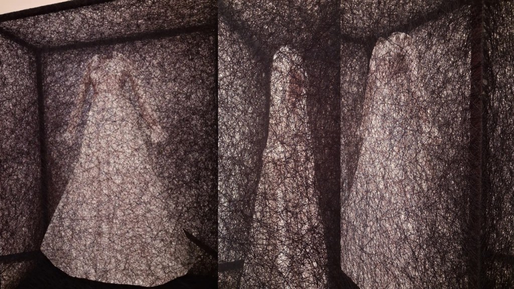 As a piece I could only think of the controls we name institutionalisation, particularly of mental institutions where even people walking around got absorbed behind density of layers of webbing, as on the left below.