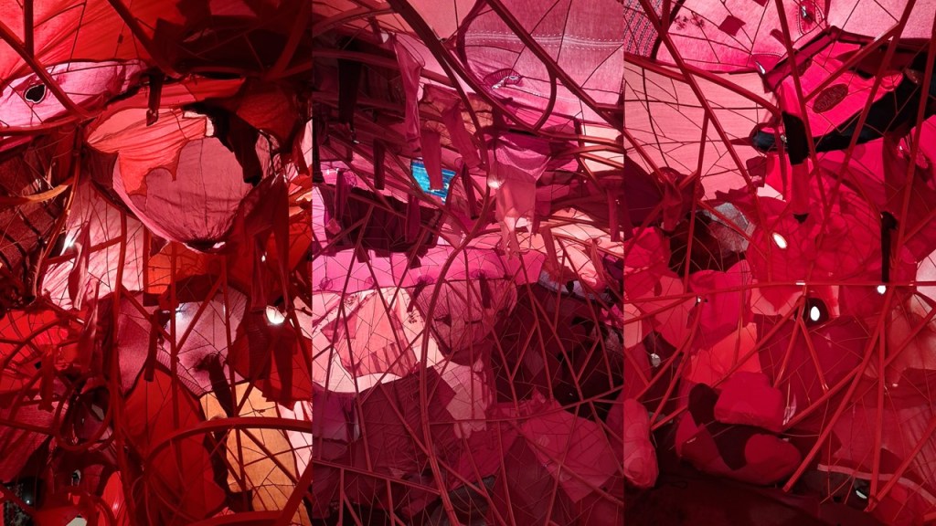 There seemed some parallel with the Threads of Life piece by Chiharu Shiota, partly because of its effect of immersing those who see it in red, but because, although entirely differently structured, the red caused by webs of red thread from ceiling to floor, or sometimes short of the mid- height of the room.