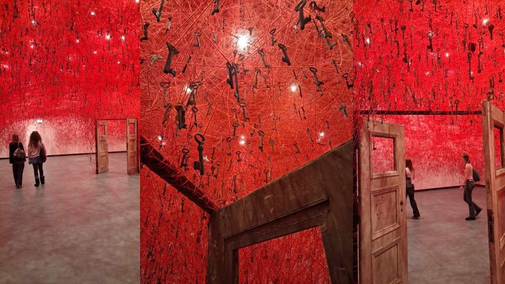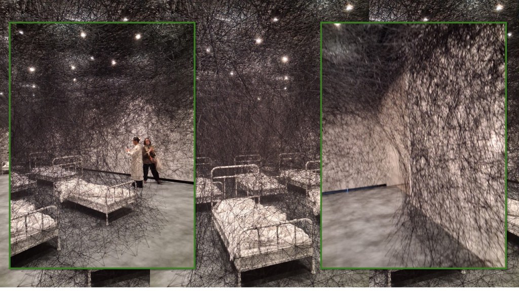 One work by Chiharu Shiota, you walk through in a snaking passage surrounded by densities of vertical thread. i call the densities because sometimes they are clustered more nearly to each other and are hard to see. Attached to the threads are papers easily seen as real letters relating to the artist’s migrant life (she was in Germany when she built this). Some, looking up, see flocks of ridsing doves of peace suggested by the piece, others (or the same at a different time) see cascades of storm and hale -toubles descending.