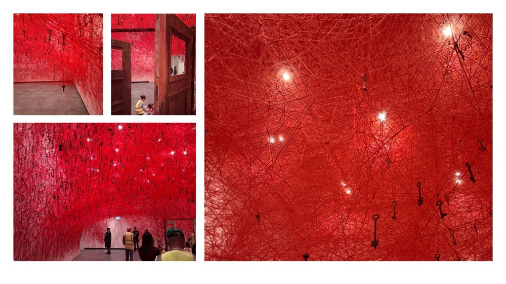 Apart from the silly jokes in that, the themes are ones equally applicable to both of these exhibitions – in parts at least, especially Yin Xiuzhen’s, ‘Heart’, a huge sculptural frame ‘skinned’ up with red and purple dyed discarded clothes and the transition to the use of red threads, as if they were arteries in Chiharu Shiota. This will all be more visible later as I progress through this blog. But string, in this respect in particular, is a video artwork by Chiharu Shiota you meet as you mount the Brutalist concrete staircase of the Hayward in transit between exhibitions (my photographs all failed I am afraid) of the artist’s body surrounded by masses of mainly transparent plastic tubes, along which sequences of deep blood-red fluid pass sequenced with air bubbles that clear the tubes of fluid momentarily. The tubes appear to infuse into your body but cannot do, of course – the image is literally of self-transfusion in which one’s own life-blood is externalised and transfused back within – a constant exchange of interior and exterior, visible and invisible, past and passing present.