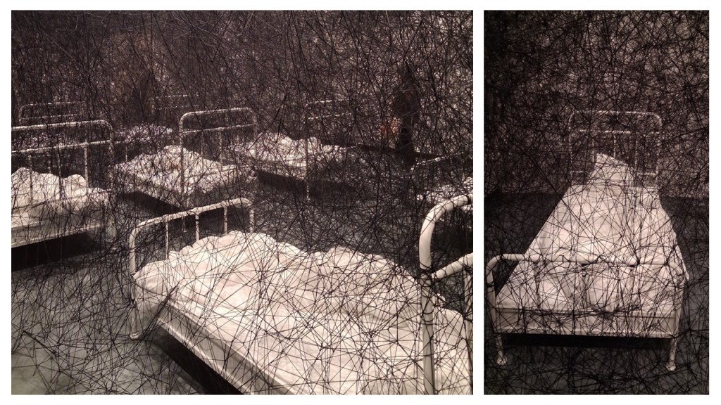 And gaps between beds seem uncrossable, or, at the best, difficult to negotiate. How is this negotiated in performance art versions of this a thing that feels like an untouchable museum piece to a visitor – the usual instructions not to touch are given on entrance – becomes something people walk, move and talk within, even though they be working to instruction.