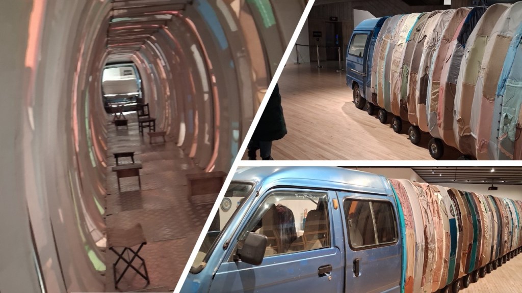 Transitions occur in small as well as large. In an adjacent room see a huge wheeled auto-tuk-tuk or auto-shuttle, but extended between its genuine vehicle ends with an a huge corridor like fitting walled by fabric clothing and containing seating like that provided for children. Transit / transition between times, space and within clothing after all is the fact of our constant shapeshifting identity in globalised worlds, for some at least – some who do it for pleasure and choice and not by coercion that is direct or indirect (indirect forms often mean a choice being going or staying and starving).