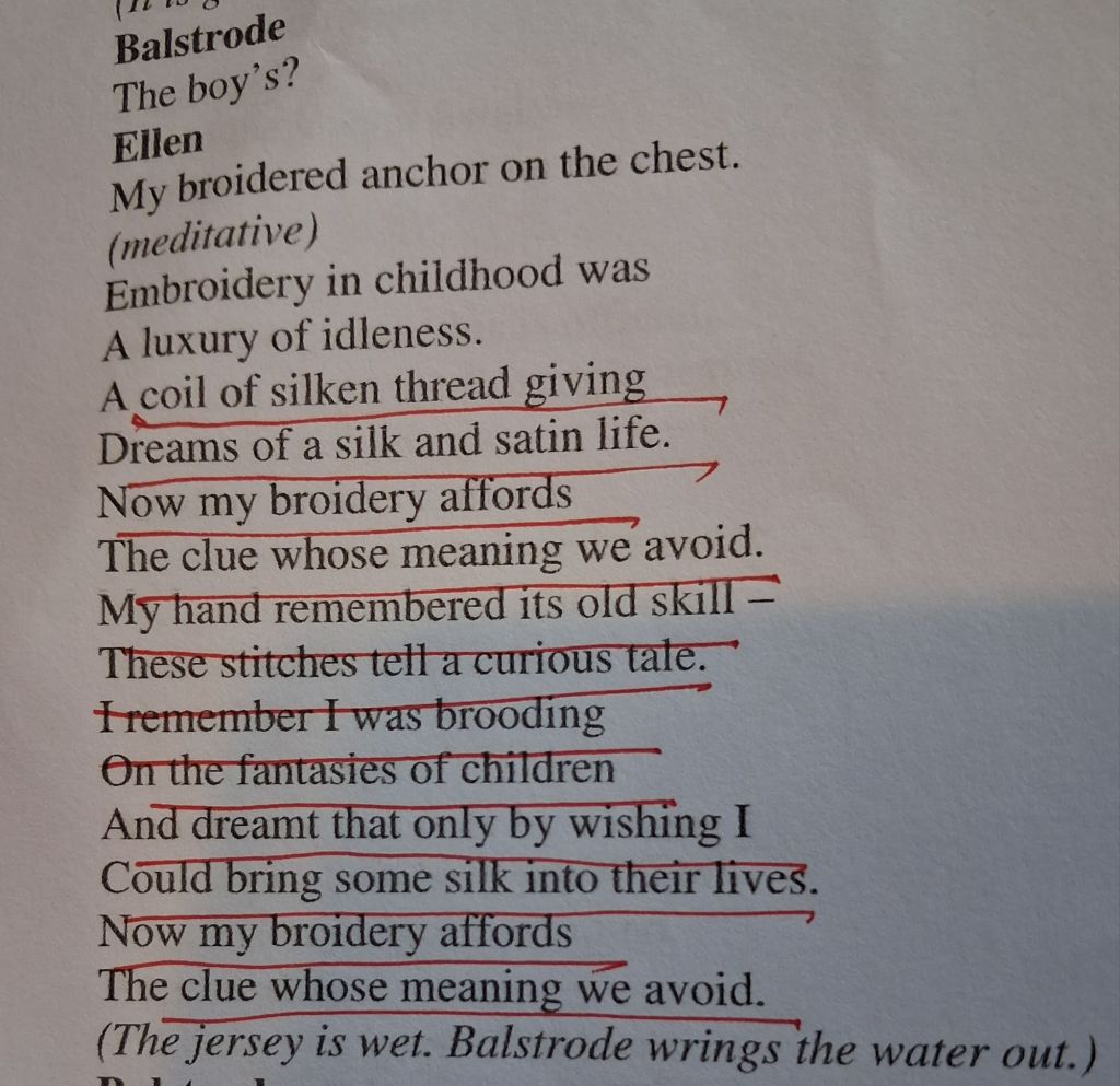 Moreover, this knitting (or netting) is potentially tragic and not only for her. Her finest production is a seaman’s jumper knitted for John, and found of evidence of his possible fate of drowning, even though we know he died from a forty foot fall from Peter’s hut on a sea cliff that could have been avoided had Peter cared enough to attend to him. She and retired Captain Balstrode find the ganzy (the name it would have in North East fishing communities whatever Wiktionary says) – see below,