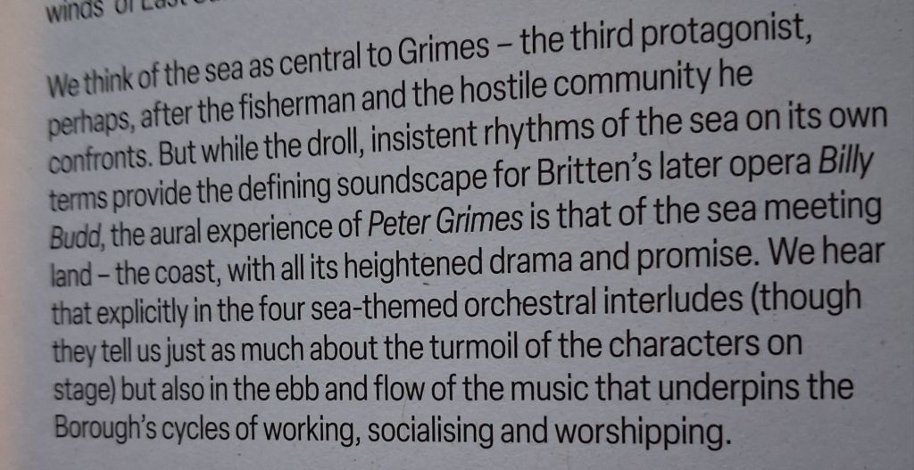 In an essay in the programme by Andrew Mellor, entitled Per Grimes: An Opera for the English (see the page fold above) Mellor says something definitive about the debate on the opera and the role of the sea, cited below: [4]