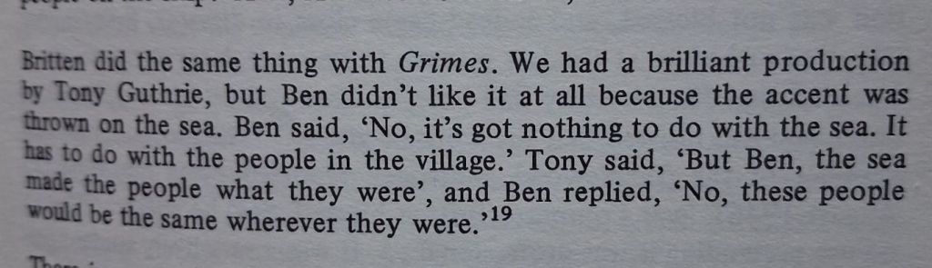 Brett goes to show that Guthrie was so convinced of the rightness of his conception of the opera that he thought those bits of it that didn’t fare well in his and his set designer’s conception were errors in Britten’s art with its inappropriate desire for ‘naturalistic staging’ and ‘scores of conversational scenes’. Britten clearly wanted to differ, and specifically picked out, according to an account by director Ande Anderson of Covent Garden, who heard of it whilst later directing Billy Budd with similar issues in mind, his dislike of Guthrie’s treatment of the sea as symbol only: {2]