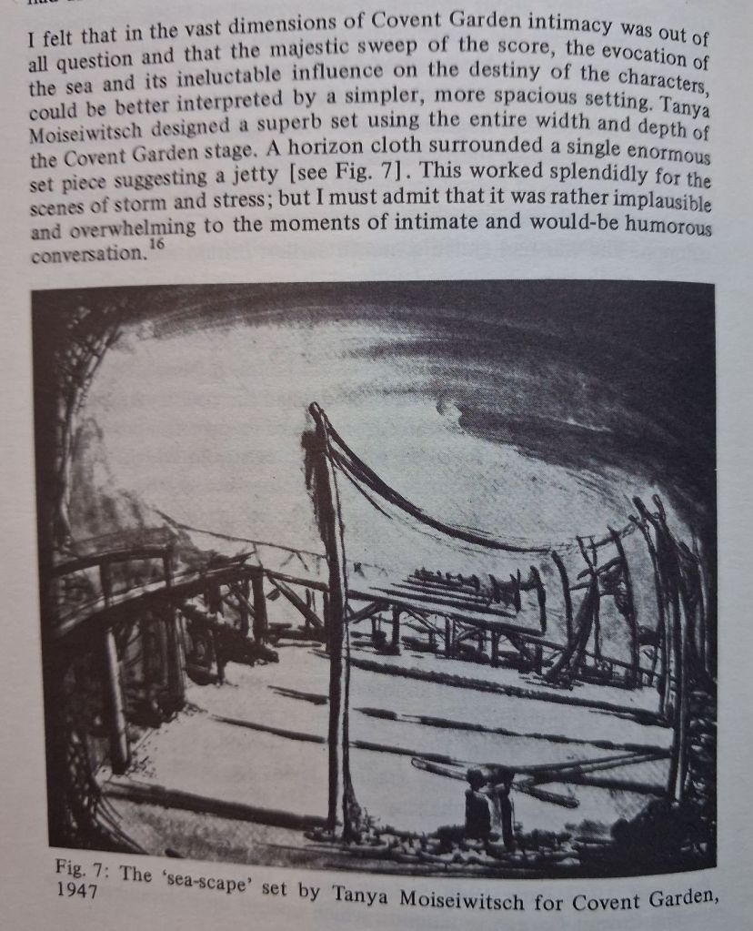 Strangely enough I had discovered earlier that the significance of the sea in the opera became enough of a controversy early on in its production history for Britten to feel he had to comment on it. Philip Brett in an essay on the changing production values emphasised in earliest productions of the opera points to how Tyrone Guthrie, directing the opera for the Covent Garden Opera House in 1947-8 determined to reverse the tendency to naturalist or social-realist of a community – in recognisable shouses and houses by the sea to one in which the sea was symbolic rather than a feature of social-economic communal life. This is how he describes his and the set designer’s work, together with a study design of the set painting used: