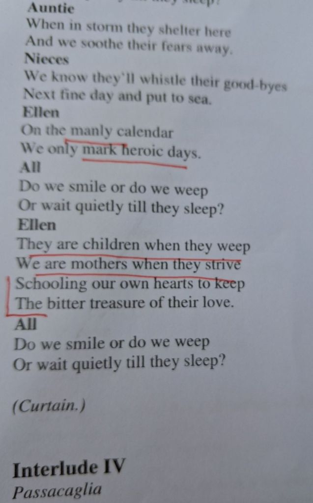What matters to communities focused on the economic exploitation of the sea’s resources is how the weather, tidal variation or the group psychology of a herring shoal impact their routines and necessities of life, especially set against human expectations of time. For storm and its sequelae, flood, regulates their lives over and above the regulations set there by human custom or supernatural revelation. Think of the meaning of the ‘fog horn’, for instance – it seeks to compensate for a barrier to human processes on the sea set up by changes in weather. Much as we like to see time apportioned by human need, the weather re-apportions it (hence the relevance of this opera to my choice of prompt question). Humans, in choric statements, tend to see time in terms of ordered rhythmic and cyclical slots for human activity – hence the first chorus, which already contains a gendered split in how even natural cycles of the sea (its tides that vary against how human ‘biological clocks’ operate: