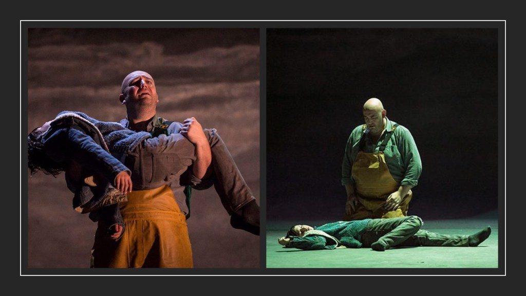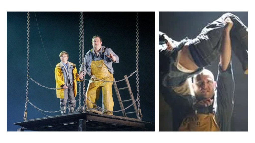Some of the items in the list given above truly lie in Coghlan’s mind alone, such as the feel of surfaces and smells in the air – art rarely serves these senses literally.However, this is not the case with ‘shoal’ evoked to represent that the community’s life hangs around herring shoals and is not unlike one itself in its variation between crowding and dispersing, However, the sense of the ‘huddled together’ can be created with theatrical proxemics and stage-space management, and is, in many ways, by staging in sets, properties and proxemics in the Opera North production, from moments of tragic isolation, like Peter reducing himself to the nakedness of his birth in order to kill himself, to the moments where he appears like Frankenstein’s creature holding aloft a child killed by ‘accidental circumstances’. See some moments below: