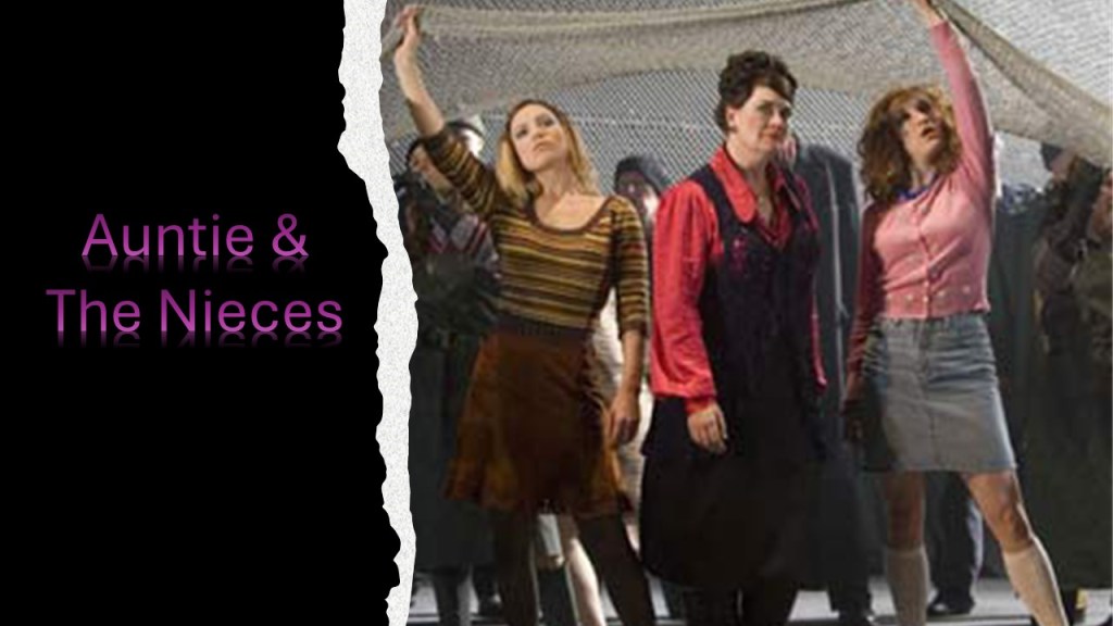 In the picture of the net in the production above, a portal to its semi-obscured interior is created at the front of the fishing-net-cum-mantle-of-community that is like the entrance and exit from a tent. However, that portal is supported mainly by the arms of the ‘nieces’, the prostitutes who serve under the madam of The Boar public house known as ‘Aunty’. Often we feel the community – especially those of its working (and professional) men of the Borough is held together by the caring ministrations of women, including sexual ministrations. It is no accident that both Helen Orford and the nieces sing together one of the most haunting if semi-light-hearted group so musical highlights, to me at least, of this production about the burden involved for women in alleviating the dreadful heaviness of male despondency about their work and sense of responsibility, real or otherwise, for they only want themselves reflected in the mirror of their ‘heroic days’ only.