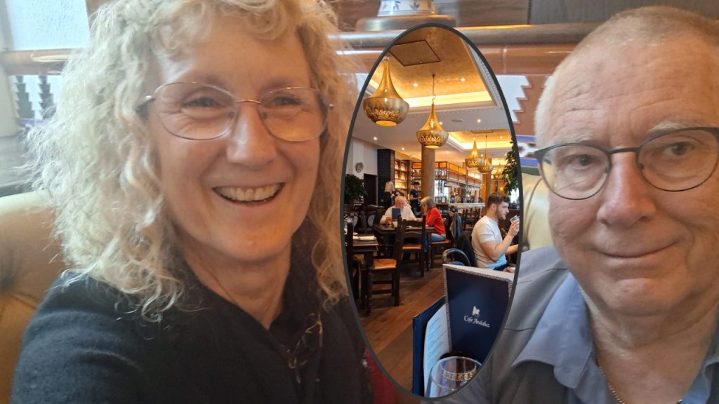 I prepared myself as always to see the already acclaimed production of Benjamin’ Britten’s Peer Grimes by Opera North, which played for one night last night at the Theatre Royal, Newcastle with a blog on reading George Crabbe’s story (Crabbe has a silent role in the opera – referred to and addressed but never singing back in reply) from The Borough (read it at this link if you wish). and on seeing a DVD production from Zurich but focused on the tradition of ‘queer’ reading of the opera (also readable – at this link). This blog follows seeing the piece with my wonderful friend, Catherine (here with me enjoying the tapas supper she bought me in Cafe Andaluz for inviting her to use my reluctant hubby’s ticket).