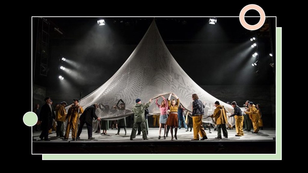 Anthony Ward’s set – a grey-blue seascape, melting sky into sea, deftly lit by Paule Constable – encloses the action on three sides, trapping the chorus in a crude, makeshift world of wooden pallets (that must supply pub, hut, church and Moot Hall) and a giant fishing net. Raised by a central pulley, it engulfs The Borough’s citizens in a strange embrace – blinding and binding them under its mesh, a totem of belonging. Once we’ve seen it, the opening tableau – Grimes’ naked body washed up wrapped in a net – takes on a more sinister significance. [3]