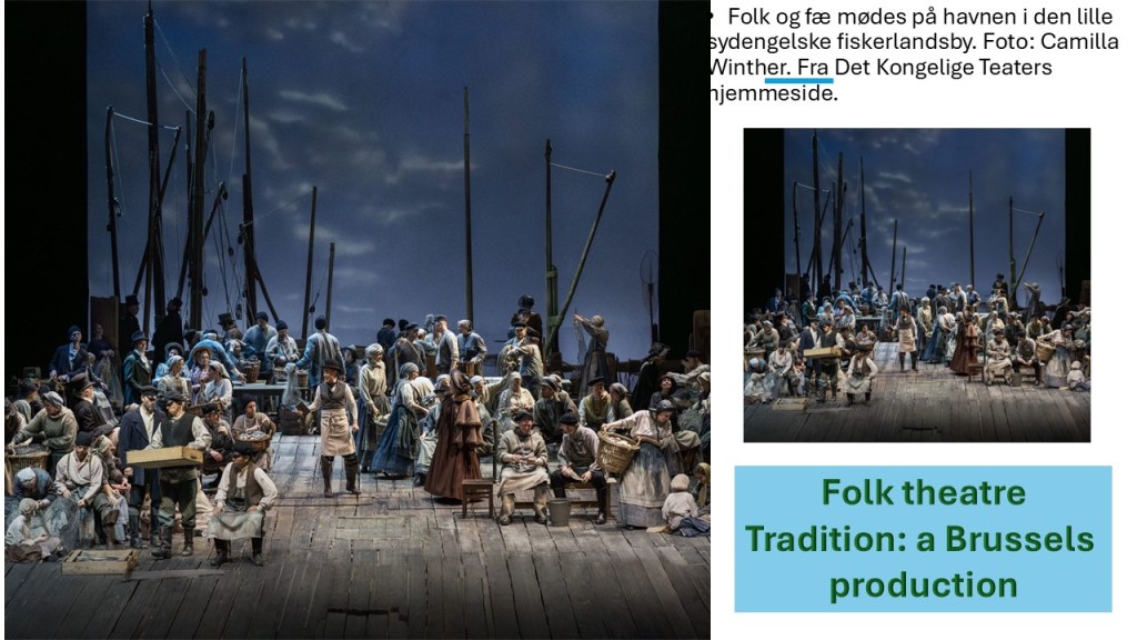 The first time we see the net is when behind, and within it, we see the ‘squalid dames’ of the community (that is its poverty-stricken married women) mending it. Soon however its connection to the tasks of fishing communities is less about the practices of sea industries and more about finding a symbol for how a tight community works and why to hold itself togethervand limit its contents to those ready to follow its norms. That is, it offers security at the price of accepting its limitations and prohibitions of access and egress. That net returns at the end of the opera representing the community but with its margins held within it in the repetitive motion of a wave-like sway, as if the cycles of the sea are represented in the monotonous but often beautiful actions of breaking waves on a shore or the flow of the tides back and forth in regulated sequence. But that notion that the sea is a thing of regularities is itself a lie. Hence Britten was right to say that the people would have been the same ethically and in character wherever they lived and in whatever unfair allocation of resources – for that went beyond the economy of fishing communities.