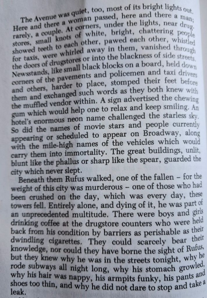 The reduction into the oneness of one’s own self explains the power here, of the phrase, ‘rarely a couple’, but not because the issue here, yet,is coupledom as a means of rescue from isolation but because no-one feels supported from being ‘fallen’ or falling, imaginatively with the skyscraper towers around them, for having fallen there is further to go – down to the position of Rufus, who will jump from the George Washington Bridge to his death soon after this part of his story is told. Support for life is reduced here to the lies of advertisements, for gum that aids you smile and relax, or so it says, its essence reduced to towers that might be a blunt phallus or a sharp spear, signs of male defence against vulnerability. And then the statement: ‘Entirely alone, and dying of it, he was part of an unprecedented multitude’. A multitude of lonely people with nothing to bind them together. People who are not policemen or taxi drivers are ‘others, harder to place’ whose only communication and communion is, at anonymous blank black newsstands to have ‘exchanged such words as they both knew with the muffled vendor within’. Think of that phrase – ‘such words as they both knew’. Communion is necessarily limited – by differing language perhaps, but perhaps not – perhaps knowledge itself has no common or communal means of exchange. This is indeed, more brilliant than the reader yet knows, for its glimpse of the Broadway show signs, which seems arbitrary here, a mere contingent sight, is not so but we, and perhaps Rufus, has no memory of its relevance. Even the story told up to his death does not reveal its relevance, though it does detail some details of his past as a boy in Harlem. By the end of the novel, we are introduced to Eric, who flees to France, escaping the shards of his break up with Rufus as his lover, but which, on his return and rise in theatrical circles helped by Steve Ellis, will gaze at the same legends fronting Broadway in the expectation that his name will soon join them – for he is an actor, though ‘resting’ from such labour in France when the novel opens – not that we know that until we are introduced to him in France with his French boyfriend Yves but only much later learning of his relation to Rufus, and other characters. The first full section on Rufus’ life does not even introduce to his queer being, except that he says at one point, he wishes her were ‘homosexual’ and talks of, in his misery, reluctantly ‘peddling his arse’ to make enough money to eat.
