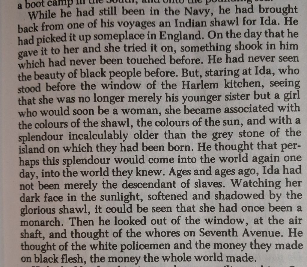 As a white man I find that difficult to read, and wonder, even now if it underplays the power of white hegemony and entitlement in the light of common human ‘affliction’ of not knowing who you are, a condition that seems to be related to the alienation and anomie that Baldwin learned to be common to humans from French existentialists. But it is the reason why Baldwin allows latitude to some of the symptoms of racism in White people, seeing them as symptoms at a deeper level of white people ‘not knowing who they are’ and reacting likewise with vengeance at those who did, or appeared to do, or couldn’t care less. The Baldwin who could examine Black community in Harlem in Go Tell It on the Mountain, and white queer community of a different kind in Europe in Giovanni’s Room, found it necessary in picturing the USA of Another Country as a blueprint of global community. In an earlier blog (see this link) I tried to show how Baldwin in his first novel aped the mission of St John, seen as Gospel writer and Apocalyptic Visionary (as one person probably wrongly), but there is something apocalyptic-visionary in the mission of Another Country too. Early in the novel, Baldwin describes Rufus’ flight from Harlem to ‘a boot canp in the South’ and Naval service. In this memory he remembers bringing back a shawl that seems to turn his beloved sister Ida into ‘the woman clothed in the Sun’ from Revelations Chapter 12 v. 1 (“And there appeared a great wonder in heaven; a woman clothed with the sun, and the moon under her feet, and upon her head a crown of twelve stars: …”). Though I see no moon in the passage below, the sun and its clothing effect (multi-coloured like a global community) and the ide of Ida as a monarch’ – presumably an African Queen, and therefore ‘crowned’, does: [6]