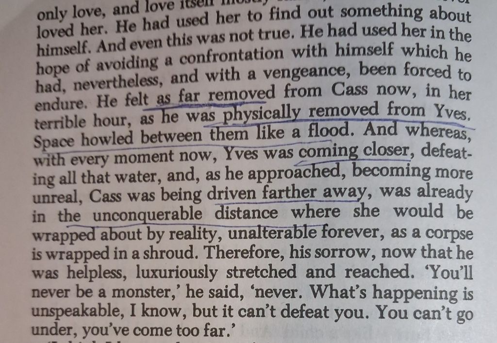 Now the thing I wanted to show after I read this novel is the brilliance with which it plays with the varying different distances between its characters and groups, and the interaction of each different kind of distance with it each: physical-sexual, Touch (not the same as the latter because cognitively and affectively interpreted by persons), emotion, thought and contingent behaviours. But somehow I feel I must leave it with one small piece of writing. Here Eric is thinking of two different kinds of distance between he and Cass, with whom only yesterday he was locked into an affair, and his lover, Yves, on his way soon from France. He is prompted to it by distances within himself which will take so much closer, in so many ways – touch included, even sexual penetration – to Vivaldo. Just read it well from: ‘He had used her to dind out somerhing about himself. …’. It is definitive Baldwin: [9]