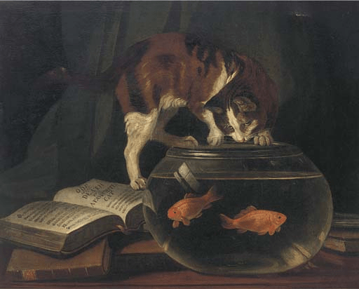 In the nineteenth-century picture, the appetite of the cat is the motive that causes danger to their lives throughout, that part of Gray’s meaning that animals are thought to have specialised tastes that drives Gray’s line: ‘ What cat’s averse to fish?’, though that line is used as an analogy for the liking of gold by the ‘female heart’. No such ‘moral analogy is in the painting. The fish are what they are, kept to be seen through the transparent glass of a ‘goldfish bowl’, far too small for the care of a fish whose maintenance needs have throughout their popularity been very wrongly and cruelly underestimated. Humans make ‘pets’ in order to exhibit their own taste, entirely cut off from care. They are good pets because they give of their apopearance and can ask for, and therefore get nothing in return, not even a suitable habitat.