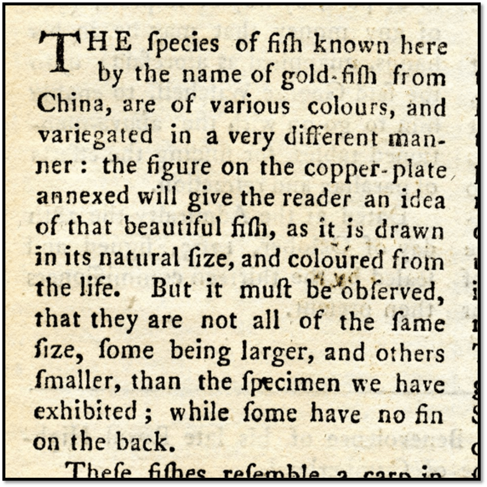 In the eighteenth century a ‘goldfish’ was valued clearly for more than its colour association to gold. The fish favoured in the eighteenth century were as often those where selective breeding also favoured exotically part-coloured examples, as might be inferred from this section of The London Magazine of 1765, from this internet source.