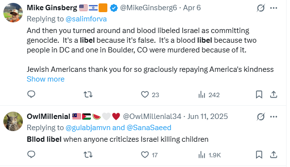 They insist that to accuse a powerful military state with a vast secret service (Mossad) and army (IDF) and nuclear and other armaments is is to blame Jews for crimes they would not commit. But Israel is not and never will be the only voice of world Jews, and visible wars, fought viciously against civilian targets as well as military ones) are not invented lies. If antisemitism is as strong as it is, which I truly think it is, then Israel benefits from that turning that belief into a cover for breaking international law and calling those who name its breaches ‘blood libelers’ (antisemitic blood libels are however a real phenomena in Christian history).