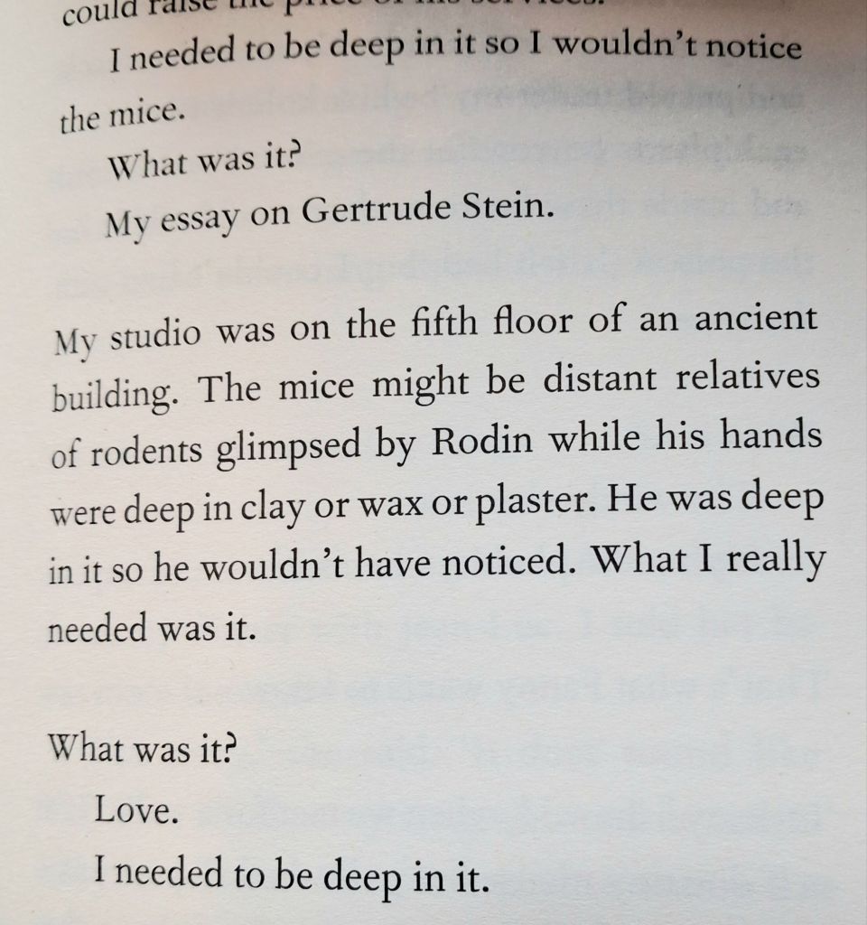 I think we can see that ‘it’ is a deeply structured impersonal thing, akin to an existential statement (‘It is …’) more profound than Yahweh’s ‘I am that I am’ or Descartes ‘ cognitive shadow of that made visible and tangible by Rodin’s The Thinker (Cogito ergo sum – I think therefore I am), because it is something larger than being yourself, something you can be ‘in’ and contained by not just ‘be’. This seems to be part of a desperation of the later repetition of the question when the narrator, plagued by mice needs to be in something to evade tiny disturbances. Is ‘it’ her ‘essay on Gertrude Stein’ or is it ‘Love’. Whichever, or something else: ‘What I really needed was it’: [23]