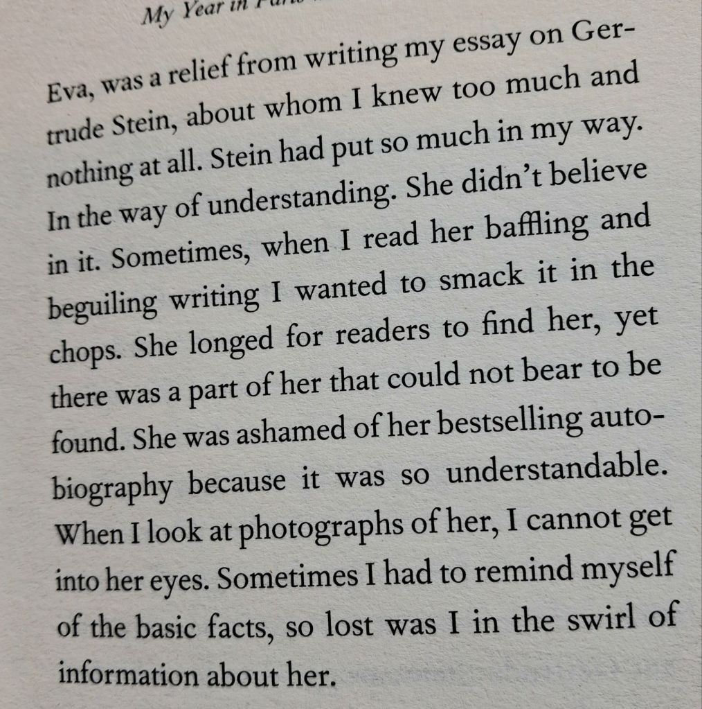 I love that writing. It is the perfection of Levy, who I always red though I do not always keep her for rereading. This one I must and will – but only in part because she is a perfect writer, for that goes with all her books, but because it moves us nearer to Gertrude Stein, and that is worth a lot to me. And, I agree, I am not sure I believe in the primacy given to ‘understanding’ in all realms – sometimes it defects from deep learning, because it puts articulation needs before the purpose of learning, whatever it is! If you need more lovely expression of it see this: