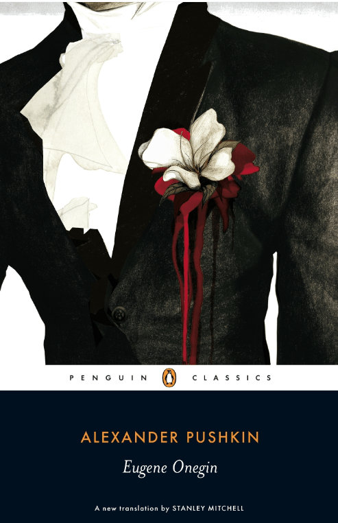 Don’t even try reading the above – I didn’t. I haven’t a word of Russian and can’t even recognize or sound out the character-letters of the language.And besides, its probably best to have more of the context verse (and in a good translation by Stanley Mitchell – one thoroughly informed by the nearest unrhymed – for more literal accuracy – translinear version by Vladimir Nabokov). The new Mitchell Penguin translation even has a totally appropriate cover – pretending to be Onegin finely dressed and represented not by a face but glamorous attire sporting a huge attention-drawing lapel bloom and red ribbon.